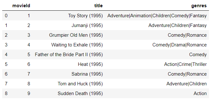 pd.DataFrame(np.array(movies[1:10]),columns=movies[0])