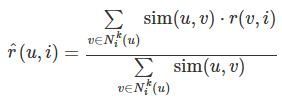 $\hat{r}(u,i) = \frac{\sum_{j\in N_{u}^{k}(j)} sim(i,j) \cdot r(u,j)}{\sum_{j\in N_{u}^{k}(j)} sim(i,j)}$
