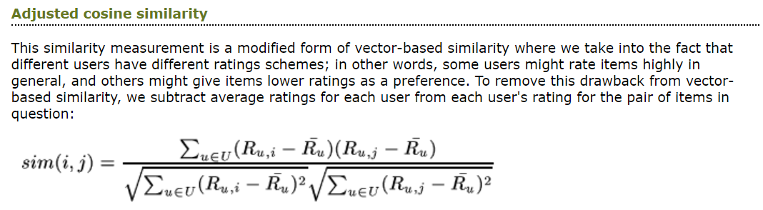 예를 들어 어떤 사람은 $a$영화에 2점 $b$영화에 4점을 주었다. 또 어떤 사람은 $a$영화에 1점 $b$영화에 2점을 주었다. 두 아이템의 유사도는 1이다. 두 영화는 육안으로 봐도 사뭇 받은 평점이 달라보이고 완벽하게 같다고 보이지는 않는다. 이에 조정된 코사인 유사도를 활용하면 각각 평균을 빼주게 되므로 각각 값이 척도를 반영할 수 있게 되어 위의 문제를 해결해 줄 수 있다.