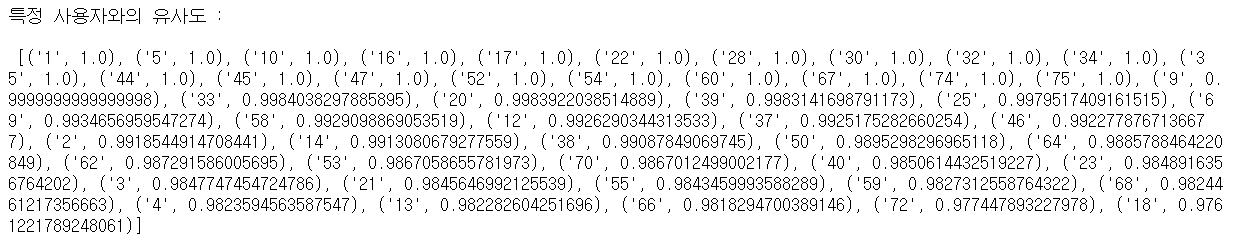 print("특정 사용자와의 유사도 : \n\n",neighborhood[:50])