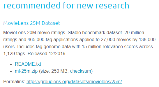 추천시스템 연구 분야의 경우 성능을 평가하거나 다른 알고리즘의 변형을 공식적인 데이터들을 통해서 비교하고, 기준 등을 명확히 한다. 이 MovieLens 데이터는 많은 논문에서 공식적으로 사용되어 성능 평가 등을 측정하는데 사용되곤 하였다.
