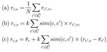 (b)공식을 설명해보면 특정 사용자 $c$와 $\hat{C}$(특정사용자 $c$와 유사도를 구할 수 있는 사용자들 집합; 동일한 항목에 대한 평가 자료가 있는 사용자들)에 포함된 $c'$와의 유사도를 모두 구한후, $c'$의 아이템 $s$에 대한 평가r_{c',s}를 곱한 것들의 합을 일반화를 위한 요소인 $k$를 곱하는 것이다. 보통 $k$는 다음과 같이 $c$와 모든 $c'$사이의 유사도를 모두 더한 값이다.