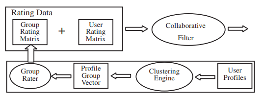 CBF, CF의 결합을 위해 클러스터링 알고리즘을 이용한 방법을 소개한다. 먼저 의미론적 콘텐츠 정보를 만들기 위해 사용자 프로필을 클러스터로 그룹화한다. 그런 다음 그러한 클러스터들을 아이템으로써 처리하여 추천을 위한 새로운 user-item 행렬을 만든다. 마지막으로 새롭게 만든 행렬을 기반으로 기존의 CF알고리즘을 적용하여 사용자에 대한 예측을 진행한다.