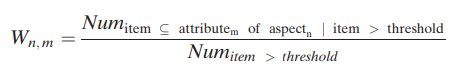 여기서 $NUM_{item}$ $>$ $_{threshold}$ 는 순위 값이 임계값보다 큰 아이템 수 이고, $Num_{item \ \subseteq \ attribute_{m} \ of \ aspect_{n}} $ 는 사용자 프로필 $aspect \ n$ 속의 $attribute \ m$ 속성을 포함하는 항목 수 이고, rating이 임계값보다 큰 항목 수 이다. 본 실험에서는 임계값을 3으로 설정함.
