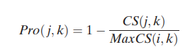 여기서 $Pro(j, k)$는 클러스터 $k$에 속하는 객체 $j$의 가능성(probability)을 나타낸다. $CS(j,k)$는 객체 $j$와 클러스터 $k$사이에 counter-similarity(유클리디안 거리에 기반하여 계산...--;) 이다. $MaxCS(i,k)$는 객체와 클러스터 $k$ 사이의 최대 counter-similarity 이다.