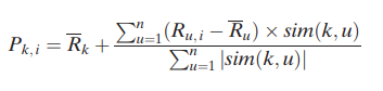 여기서 $P_{k,i}$는 항목 $i$에 대해 사용자 $k$의 등급 예측을 말하며, $n$ 은 사용자 $k$의 가장 가까운 $N$개의 이웃을 나타내며, $R_{u}$는 항목에 대한 사용자 $u$의 평균 등급을 나타낸다.