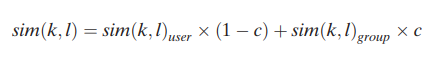여기서 $sim(k,l)$ 는 사용자 $k$와 이웃 $l$ 사이의 유사도이다. $c$는 조합 계수이다. $sim(k, l)_{user}$ 는 사용자 등급 행렬로부터 계산되는 사용자 $k$와 이웃$l$ 사이의 유사성이다. 그리고 $sim(k, l)_{group}$은 그룹 등급 행렬로부터 계산된 사용자 $k$와 이웃$l$ 사이의 유사성이다. 여기서 유심히 봐야하는게 그룹정보와 항목 등급의 강도가 변함에 따라 $c$의 최적값도 변할 것이라는 점이다.