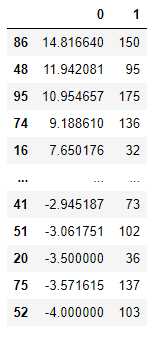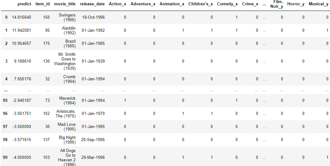 아래와 같은 결과에 첫번째 컬럼은 예측치이고, 두번째 컬럼은 아이템 넘버인데, 잘못된 부분은 바로 예측 평점이여야 하는데 그 범위를 벗어난 값들이 있다.