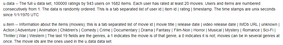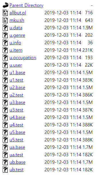 Index of unzipped files 에 들어가면 아래처럼 되어있는데 여기서 u.data랑 u.item을 가져왔다. 다운을 받고 텍스트로 다시 저장해서 쉽게 파이썬내로 불러올 수 있다.
