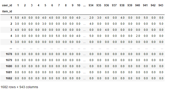 pd.pivot_table(rating1, values='rating', index=['item_id'], columns=['user_id']).fillna(0)