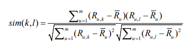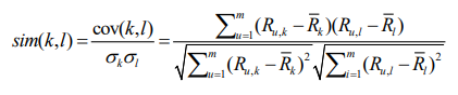 논문에서는 Group-rating 행렬을 통해 아이템 간의 유사도를 구하는 경우에 조정된 코사인 유사도를 사용하였다. 아래의 공식 생긴 것만봐도 위의 피어슨 상관계수랑 거의 흡사해 보인다. 코사인 유사도는 다른 등급에서의 벡터들이 계산되는걸 제외하면 피어슨 상관계수와 매우 유사하다. 아래의 식은 결국 위의 구했던 피어슨 상관계수와 같기 때문에 같은 코드를 사용하여 유사도를 구하였다.