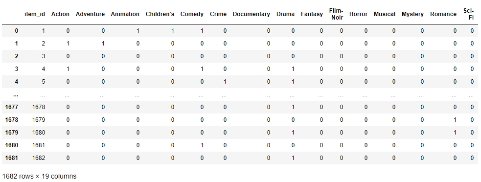 movie1 = movie[['item_id','Action','Adventure','Animation','''Children's''',