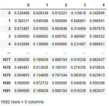 아래의 데이터프레임처럼 각 객체별로 클러스터에 속할 확률을 제안한 fuzzy k-means 로 모두 구해보았다. 여기서 알아낸 점은 각 값들이 위의 기존의 코사인 유사도와 비교했을 때 조금씩 수치가 상승된 사실을 알 수 있었다. 이로써 수치를 올려 가중을 주게 된 것인가 라는 생각을 해본다.