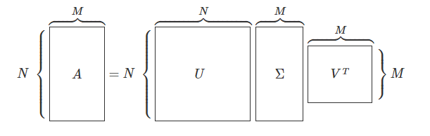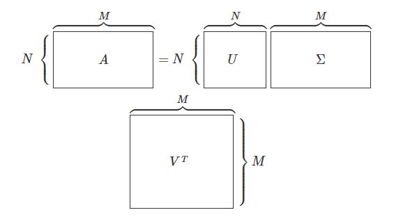 위의 특잇값분해 형태를 쉽게 설명하면 A라는 행렬을 $U$, $\sum$, $V^{T}$ 세 행렬의 행렬곱으로 나타내는 것이다. 이를 대각화라고 하며, 고윳값 분해에서 정방행렬에 대해서만 대각화를 할 수 있었던 것과는 달리 특잇값분해에서는 모든 $m x n$ 행렬에 대해서 적용이 가능하다.