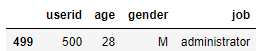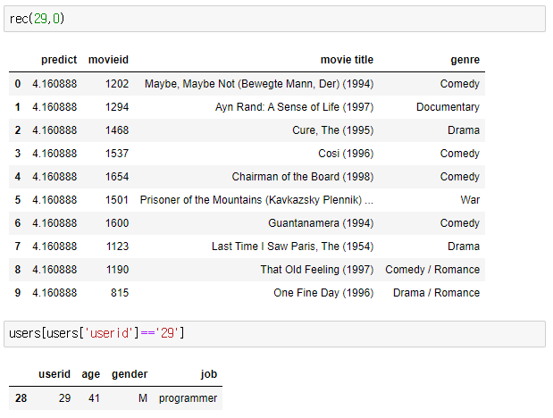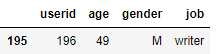 u.user라는 또다른 데이터셋을 조인하여 살펴본 결과 196번 손님은 49세에 남성 직업은 작가이다. 어찌됐건 구현의 목적을 달성하였다.