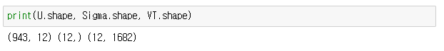# 다음의 코드를 통해 각각 행렬 U, S, V^T 를 변수에 담아낼 수 있다.