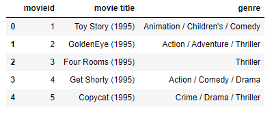 fields=['movieid','movie title','release date','video release date','IMDb URL','unknown','Action','Adventure','Animation','''Children's''','Comedy','Crime','Documentary','Drama','Fantasy','Film-Noir','Horror','Musical','Mystery','Romance','Sci-Fi','Thriller','War','Western']