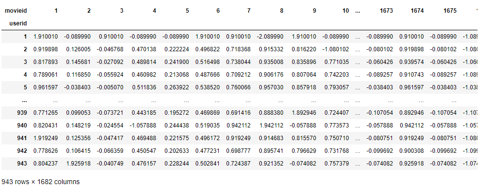 6. 이제 전혀 sparsity 하지 않은 행렬이 있기 때문에 모든 사용자에 대한 예측 평점을 구할 수 있다.
