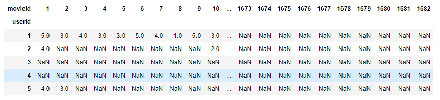 rating_table= pd.pivot_table(ratings, values='rating', index=['userid'], columns=['movieid'])