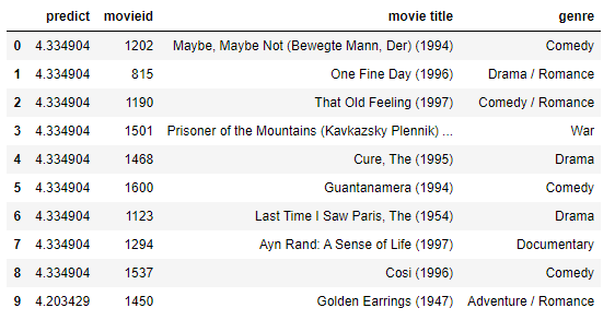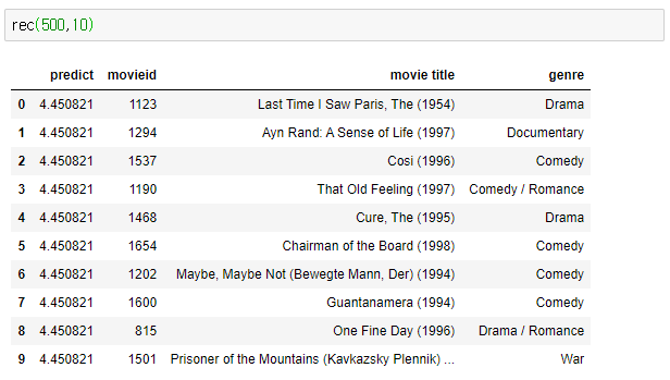 전처리를 하고 item데이터와 예측 평점 데이터를 활용하여 특정 사용자에 대한 추천 리스트를 top개 만큼 뽑는다.
