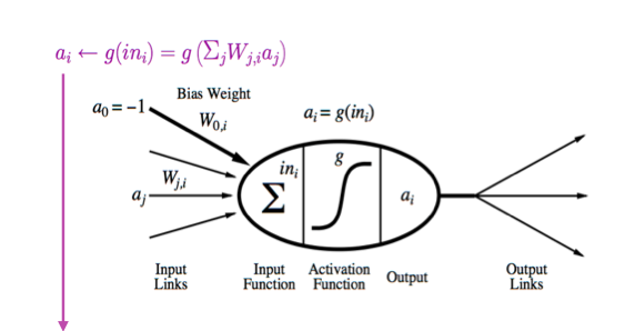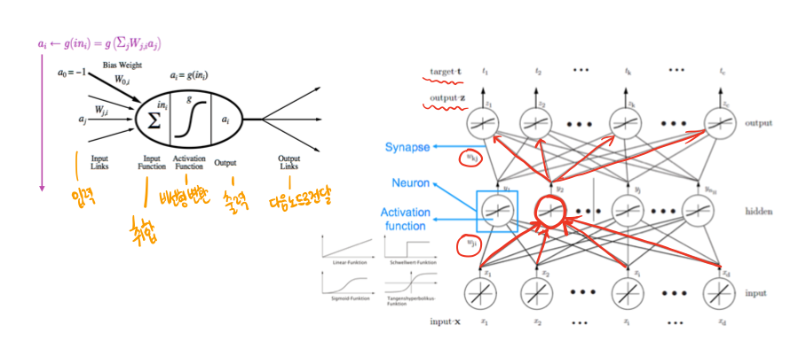 이 노드가 속한 네트워크 그림을 보면 두번 째 노드를 보게 되면 가장아래에서 $x_{i}$ 라는 입력 값을 받고 잘 안보이지만 왼쪽 빨간 동그라미에 $w_{ji}$ 라는 웨이트 값을 곱하고, 이것들을 왼쪽에 노드에서 말한 취합부분에서 취합을 하는데 여기서는 그냥 더한다. 그리고 활성화함수를 거쳐 다음노드로 갈 출력값을 출력한다.