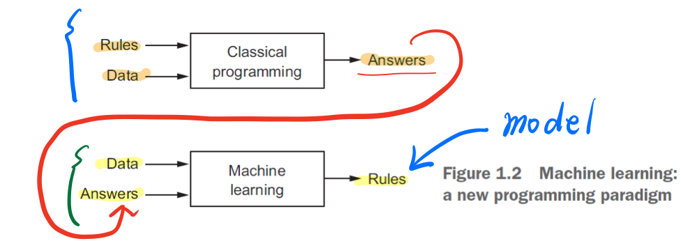 과거에는 규칙과 데이터를 입력하여 계산하게 하여 답을 구했다면, 현재는 데이터에 미리 답을 주고 답을 해결하는 규칙을 찾아내게 한다. 이러한 규칙 자체를 모델이라고 부르게 되고, 이 모델로 우리는 새로운 데이터에 대해 기계에게 니가 만든 규칙으로 답을 구해보아라 함으로써 예측을 할 수 있게 되는 것이다.
