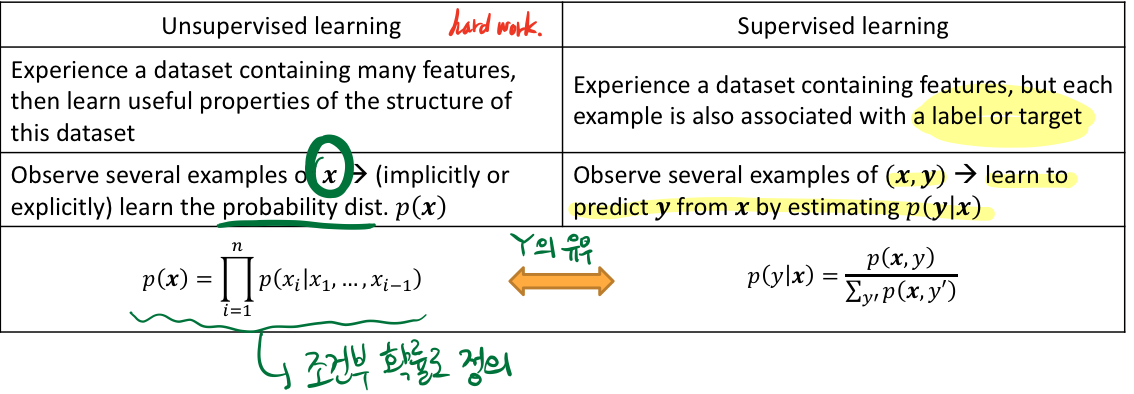 비지도학습의 경우 데이터의 구조적 특징을 학습한다. 조건부 확률로 정의된 수식은 확률변수 $x$에 대하여 $x_{i}$ 이전 까지의 $x_{i-1}$들이 발생했을 때, $x_{i}$가 발생할 확률을 말한다. 즉, 하나를 보기위해 다른 전부들의 패턴을 좍 본다는 것이다. 즉, 확률분포를 학습한다고 하는 것이다. 그렇기 때문에 이 해석이 암시적일수도 명시적인 느낌으로 학습이 될수도 있다는 뜻이다.