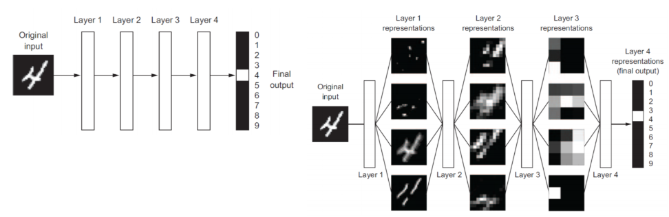 왼쪽 그림처럼 raw signal(잘안보이지만 숫자 4임.)을 주게 되면 연속된 여러 레이어를 거치면서 들어온 raw signal을 처리를 하게 된다. 최종적으로 입력된 영상에 쓰여진 숫자가 0~9사이에 어떤숫자인지를 출력하게 된다.
