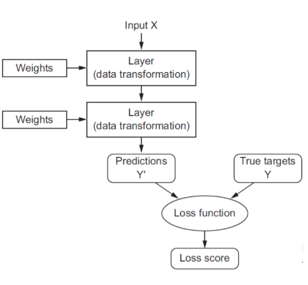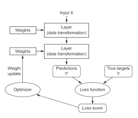 우선 네트워크에는 구조가 있어야한다. 레이어와 노드 어떻게 연결할건지를 산정을 해주어야한다. weight의 초깃값은 랜덤으로 지정한다. 그래서 초기에는 엉뚱한 방향으로 예측을하게 된다. 그리고 loss score를 줄이는 방향으로 weight를 조정하게 된다. weight가 최소가 되면 학습을 종료하고 최종적인 뉴럴네트워크 모델을 얻게 되는 것이다.