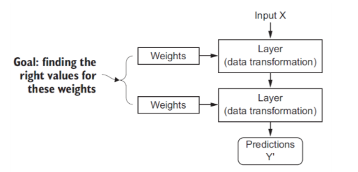 이 레이어가 하는 역할이 뭐냐? 위의 그림을 보면 X를 받으면 레이어에서 해당 가중치를 토대로 계산을 하게 되고, 이를 거쳐 Y를 출력하게 되는데, 이 우리의 목표는 파라미터인 가중치를 좋은 가중치를 찾는 것이다.