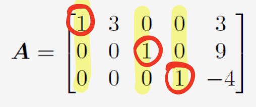 우선 row-echelon form형태를 띄고 있으며, 피벗 컬럼의 경우 피벗을 제외한 원소들이 모두 0이기 때문에 이 행렬은 reduced row-echelon form 을 만족한다.