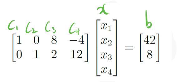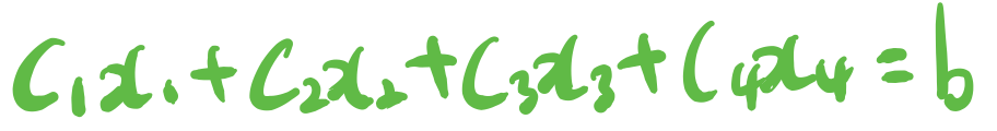 위에서$c_{1}x_{1} + c_{2}x_{2} + c_{3}x_{3} + c_{4}x_{4} = b$ 같이 나타낼 수 있었는데, 이를 벡터로 다시 나타내보면 $cx = b$로 나타낼 수 있고, 우리가 아까 구한 해$[42,8,0,0]^{T}$를 $x^{*}$라고 할 때, $cx^{*} = b$로 나타낼 수 있다.