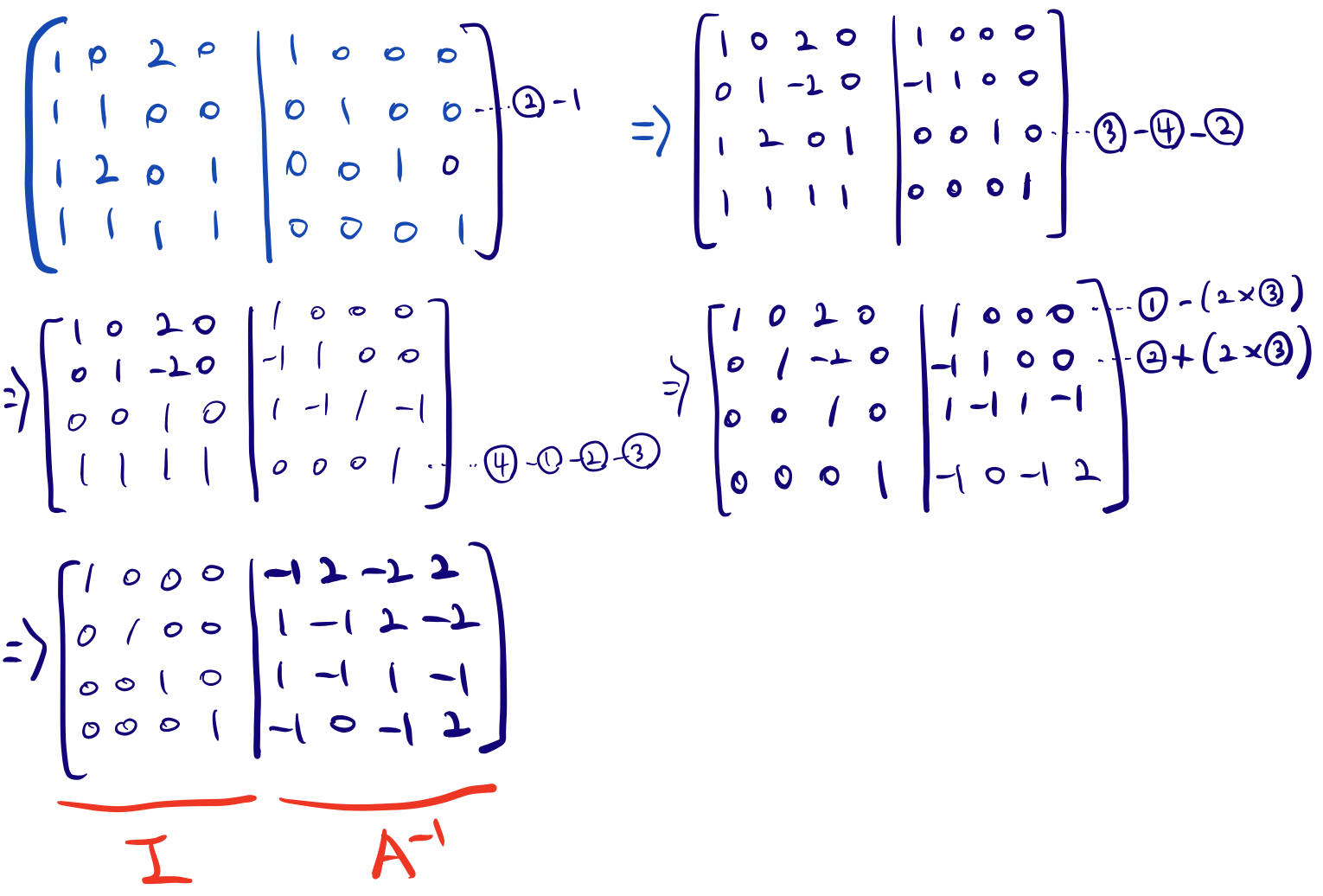 위의 계산과정은 기존의 행렬을 reduced row-echelon form으로 만드는 가우스 소거법을 사용하여 단위행렬로 변형하면서 각 방정식의 계산을 오른쪽의 기존의 단위행렬에도 똑같이 적용하면서 만든 결과 역행렬을 얻는 과정을 나타낸다.