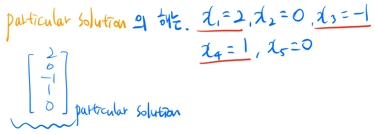 위의 형태가 reduced row-echelon form형태이다. 이것으로부터 particular solution을 순식간에 구할 수 있는데, 우선 free variables를 0으로 두면 나머지 값을 쉽게 구할 수 있다.